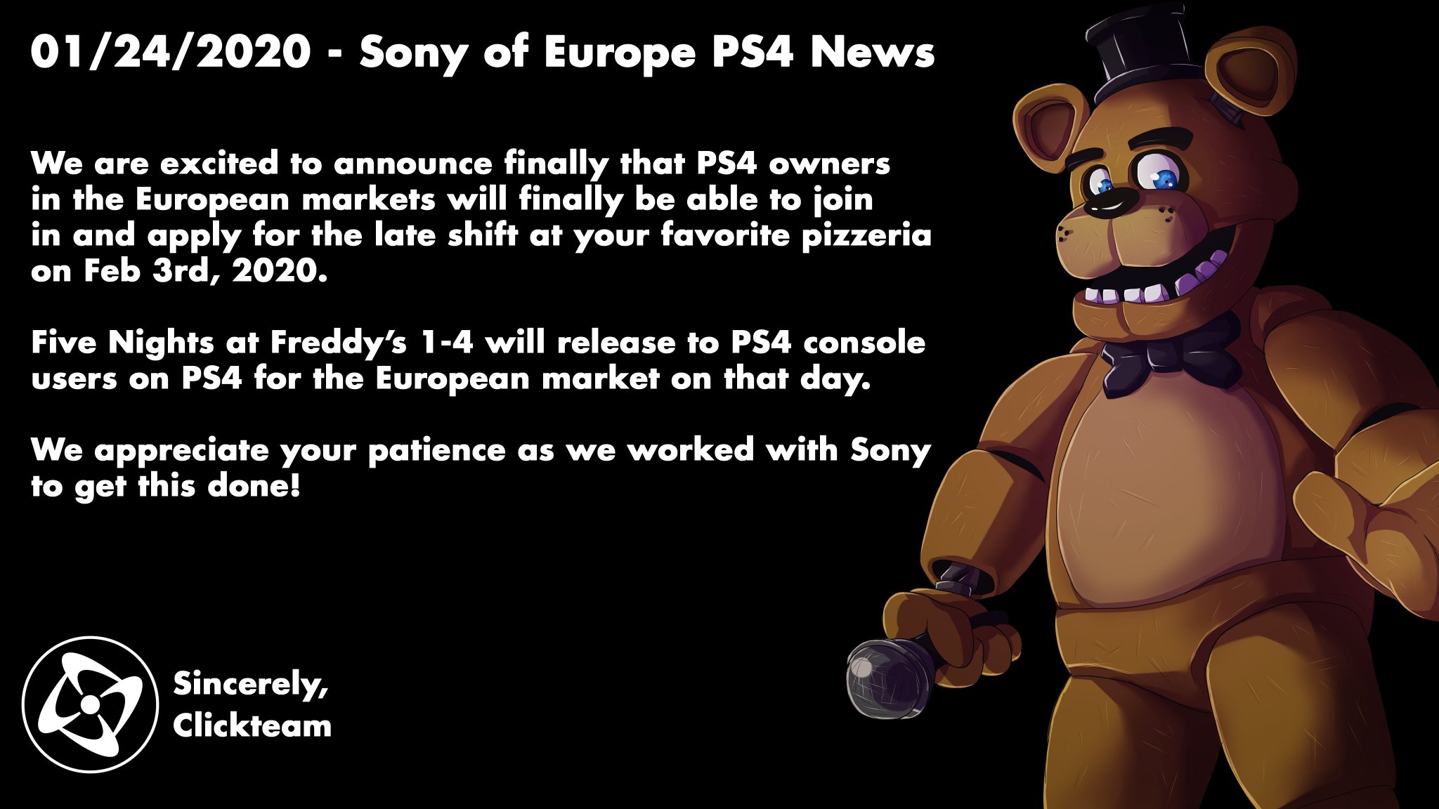 - 24 января 2020 года команда Clickteam поделилась информацией о том, что уже 3 февраля этого года 1-4 части FNaF выйдут на платформе PlayStation 4.[226]